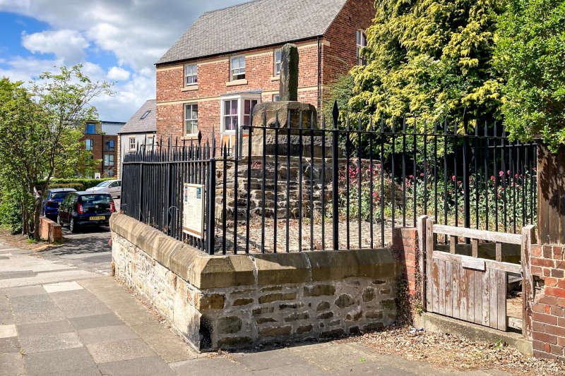 For the final – urban – quarter of the route, cross the A167 via the adjacent footbridge and continue on the footpath in the direction that would have been to the right when you came to the road. If you notice that you’re crossing a bridge, it passes over the East Coast Main Line, a short distance south of Durham Station. Directly after the bridge, turn left through an alley, onto St. John’s Road. Turn right and continue to the junction with Crossgate Peth. To your right are the somewhat forlorn remains of the ‘Neville Cross’ but with a rather more up-to-date and informative interpretation board. It’s thought there had always been a cross at this important transit point but that Ralph Neville, a senior commander at the battle and local magnate, had a more impressive one erected of which only the socket remains.