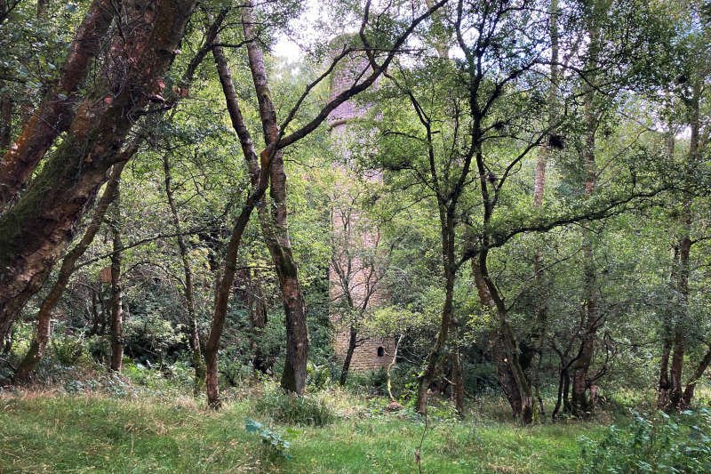 Turn L and continue ~600 m upstream, past the site of Low Mill, to another FB. Cross the bridge and turn R. Continue 1.3 km on the trail, past the site of the former East End Pit drift mine which operated before and during the 1840s. The site is marked by the “Fell Chimney” which, although fully intact, is somewhat shrouded by leaves at the height of summer.