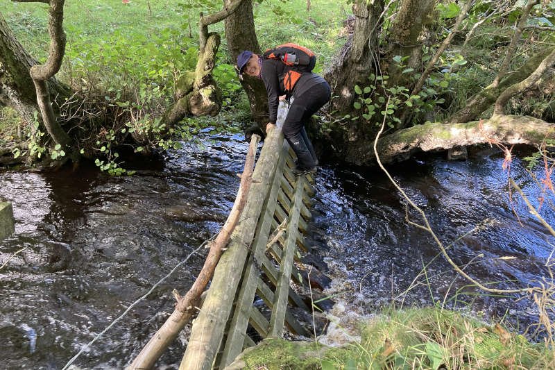 We persisted to cross the fast-flowing burn via one of those suspended fences that appear to be designed to trap debris. I wouldn’t advise it and probably wouldn’t have used it if it wasn’t as sturdy and well fixed as it was but priorities at the time seemed to insist otherwise. Apart from the impact of the flooding, the problem stemmed from the fact that I couldn’t trace the course of the burn easily on the map, due to the detail. It ran along the base of a steep, wooded slope, adjacent to fence and contour lines. I wasn’t even sure which watercourse it was — the Barrow or the Coquet.