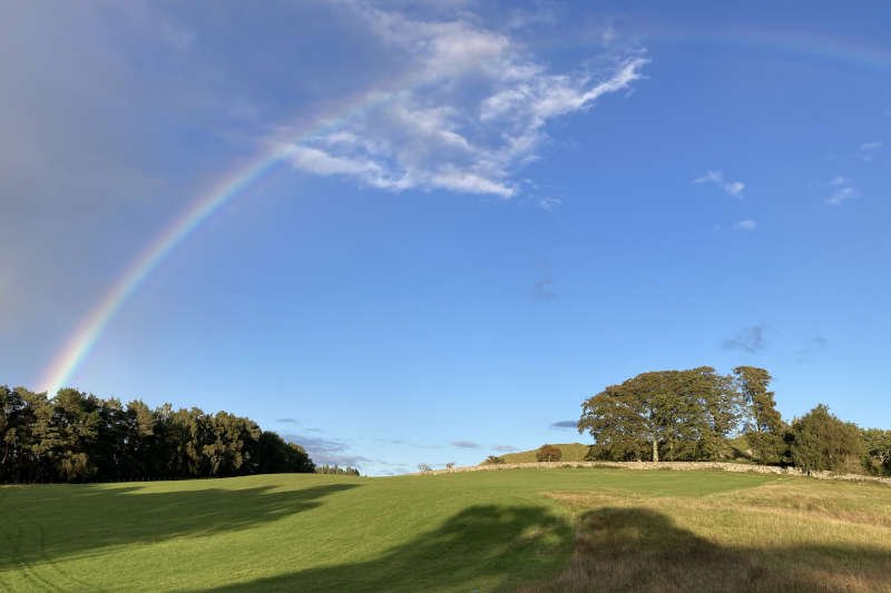 Just as we closed the gate into the car-park, the first and only shower of the day began. It amounted to little however and had no influence on the haste with which we shed boots and packs. By the time we finally waved goodbye to the Drake Stone (around 6 pm) the only evidence of the minuscule amount of wet weather we’d experienced was a rather attractive rainbow hanging romantically over the castle.